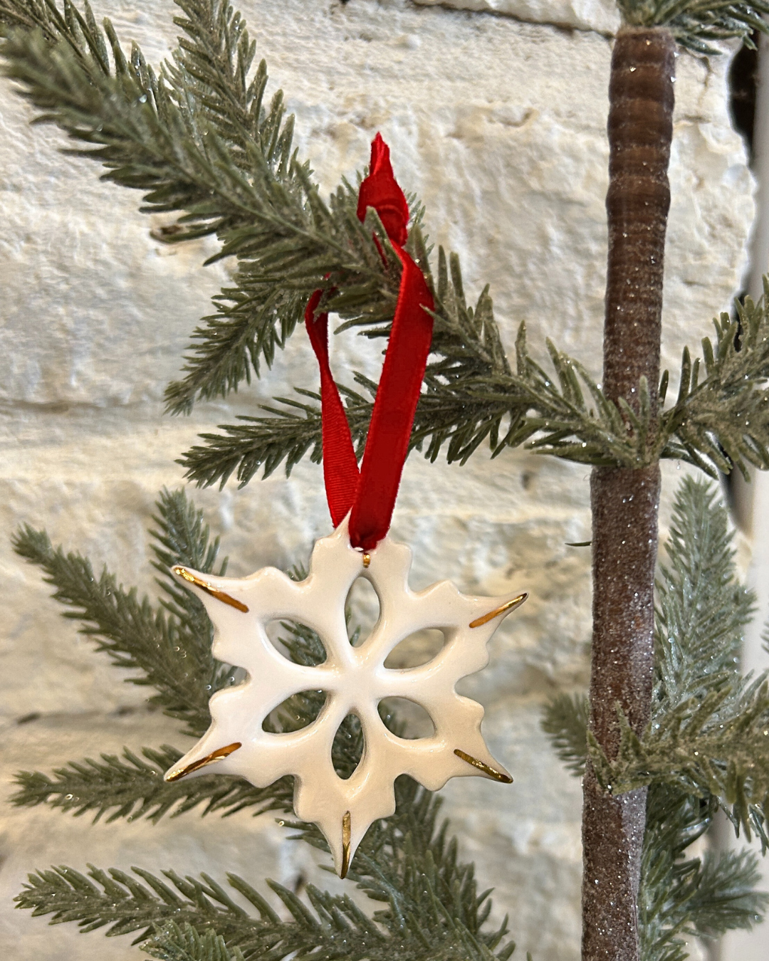 Porcelain Bone China accented with stunning 22k Gold Luster and tied with a red velvet ribbon.